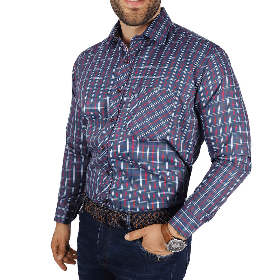 Camisa clásica corte slim a cuadros de tonos rojos, azules y blancos, esta confeccionada con tela a base de poliéster y algodón, además cuenta con un cuello semi-Francés, detalles de contraste como los botones azules oscuros, cuello y puño fusionado. Es una prenda muy elegante, fresca y fácil de combinar, te recomendamos usarla en una ocasión informal.
