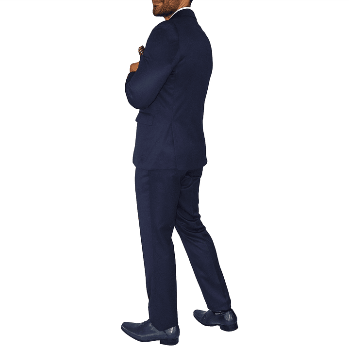 Traje semi ajustado, estilo Slim fit, este es un modelo clásico dos botones con solapa de 7cm, bolsillo con tapas, dos aberturas, con forro interno estampado. Su pantalón clásico, cuenta con bolsillo sesgado, está forrado hasta la rodilla y tiene pretina cruzada. Es una prenda de alta costura que hacen de la elegancia, un estilo de vida. es ideal para una ocasión formal así como para un día de oficina.