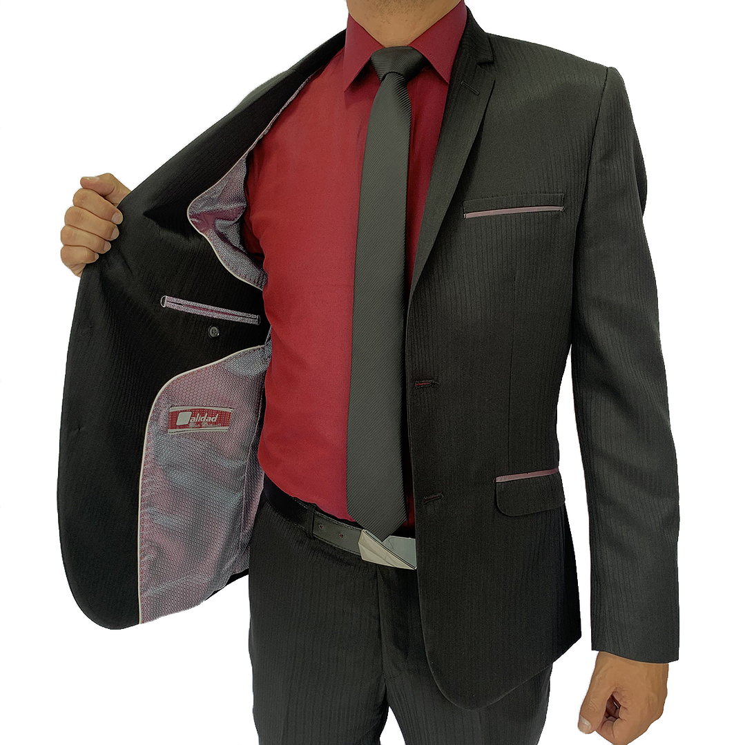 Traje de exigentes materiales, chaqueta con finos detalles en la confección que hacen la diferencia, pantalón bolsillo sesgado, pretina cruzada y hebilla de ajuste. Cod. 11624